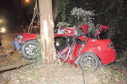 | 猛烈撞擊下車身呈形扭曲夾緊樹干。圖自香港.. |
