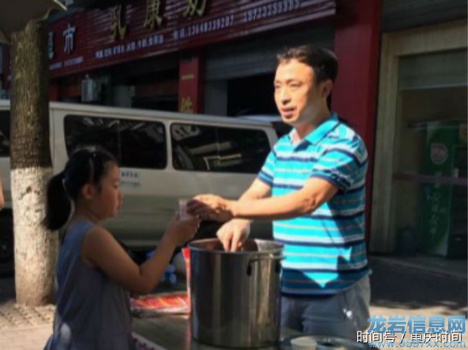 鄧先生穿著條紋藍(lán)色衣服,陽光打在他的臉上,他舀起一杯綠豆湯遞給小姑娘,小姑娘雙手接住。