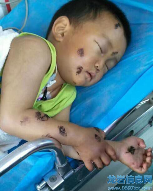 男童被蜇傷時,經(jīng)云南省文山州醫(yī)院檢查,因無法治療轉(zhuǎn)入云南省昆明市兒童醫(yī)院治療。男童的頭部和手部蜇傷處涂上了黑色膏藥,身體浮腫,傷勢極為嚴重。