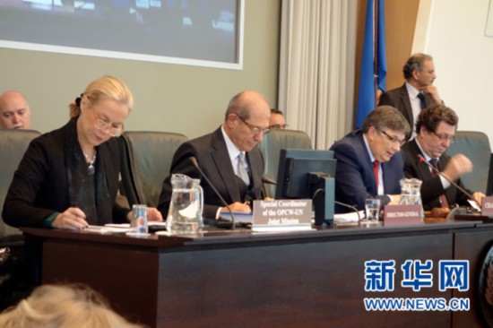11月15日,在荷蘭海牙,禁止化學武器組織總干事尤祖姆居(左二)和禁止化學武器組織-聯合國聯合代表團特別協調員西格麗德·卡格(左一)參加禁化武組織執行理事會會議。據此間消息人士透露,總部設在海牙的禁止化學武器組織15日深夜通過了敘利亞全面銷毀化學武器的詳細方案。 新華社發