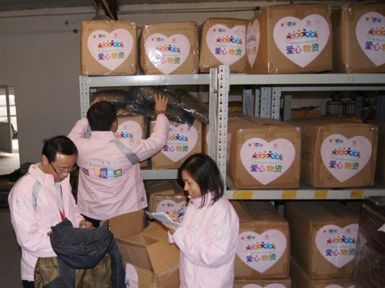 I Do基金工作人員在庫房清點物資,整理捐給西藏阿里孩子的過冬衣物。