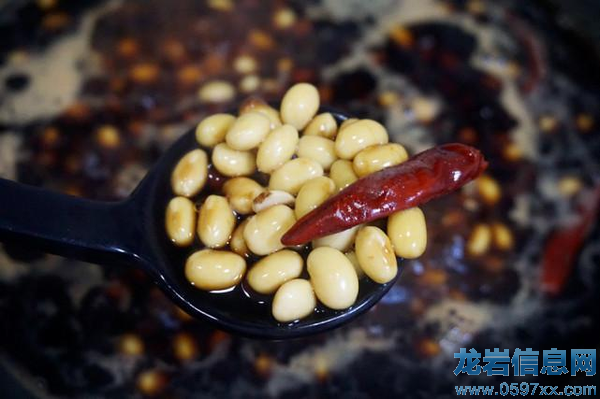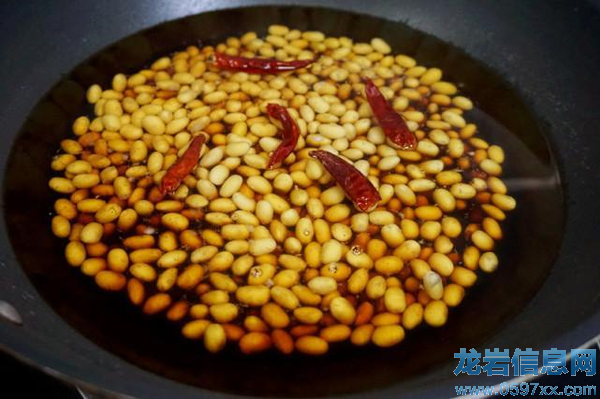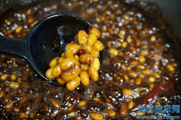 7、快收汁的時候,要一直盯著,不斷翻炒,等湯汁收干,黃豆表皮微皺就可以了。