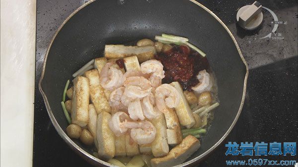步驟2:炸好的蒜子下鍋,加入蔥姜,再下入豆腐和蝦仁,放料酒、蠔油、豆瓣醬、生抽調(diào)味,翻炒均勻。