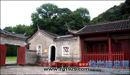 古田會址座落在上杭縣古田鎮這個群山環抱中的山間盆地。遠靠逶逶莽莽的彩眉嶺,近傍碧水流歡的古田溪,前臨稻浪飄香的田野,背倚林木蔥郁的社下山。掩隱在樹蔭下的“古田會議永放光芒”八個 紅色大字,赫然在目。