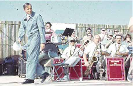 阿姆斯特朗(左)1969年12月與知名諧星鮑勃霍伯赴臺,并在清泉崗空捐機地慰勞駐臺美軍,圖為阿姆斯特朗身穿飛行衣,大談他的太空經驗。圖片來源:中新網