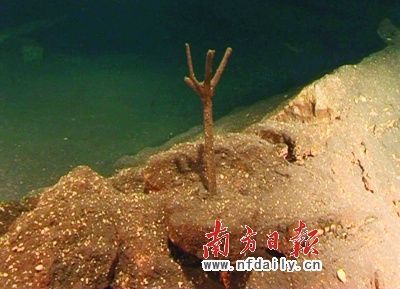 水底保留的古代工匠工作時(shí)用的銅燈架。(圖片為西樵山石燕巖水下采石遺址視頻截圖,由董國(guó)亮提供。)