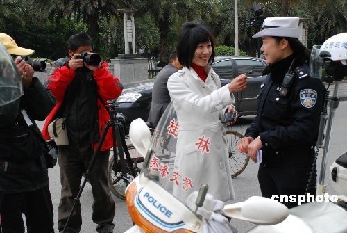 圖為桂林女子交警在街頭執勤時接受采訪咨詢。