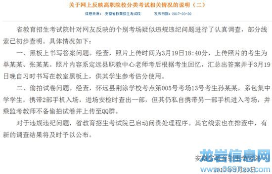 安徽省教育招生考試院表示,對于違規違紀問題,已啟動問責處理程序。其它線索也在排查中,有新的調查結果將及時予以公布。