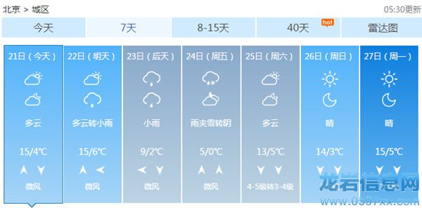 北京市氣象臺(tái)預(yù)計(jì),今天白天,全市多云轉(zhuǎn)晴,早晨有輕霧,能見(jiàn)度1至5公里,北轉(zhuǎn)南風(fēng)二三級(jí),最高氣溫15℃;夜間晴轉(zhuǎn)多云,南轉(zhuǎn)北風(fēng)一二級(jí),最低氣溫4℃。