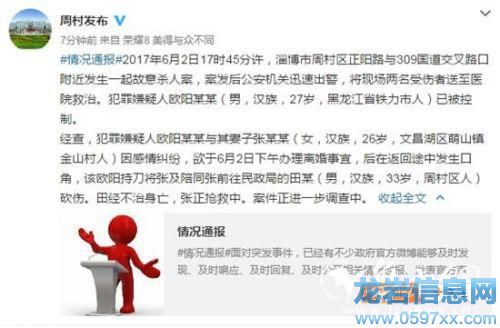 據@周村發布消息,2017年6月2日17時45分許,淄博市周村區正陽路與309國道交叉路口附近發生一起故意殺人案,案發后公安機關迅速出警,將現場兩名受傷者送至醫院救治。犯罪嫌疑人歐陽某某(男,漢族,27歲,黑龍江省鐵力市人)已被控制。