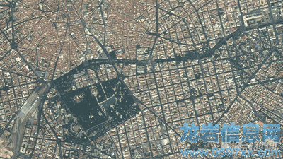 快看!圖片下方中部,一個小白點往右上方飛去。這就是衛星拍到飛機從馬德里機場上掠過的畫面。