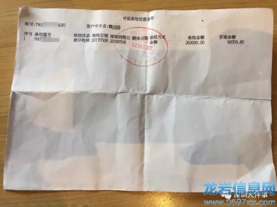 魏小鵬向記者提供一份印戳日期為"20170619"的銀行對(duì)私凍結(jié)信息查詢的證明,內(nèi)容是客戶魏小鵬的賬號(hào)為7902*****4281在2017年5月8日(凍結(jié)日期)被凍結(jié),凍結(jié)金額為260000.00,實(shí)凍金額為96559.85,凍結(jié)期為一年。他表示,這是該銀行總行給他發(fā)的證明,但銀行表示凍結(jié)賬號(hào)的不是銀行而是富平縣人民法院通過(guò)法院系統(tǒng)進(jìn)行凍結(jié)的,與銀行并沒(méi)有關(guān)系。