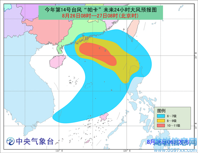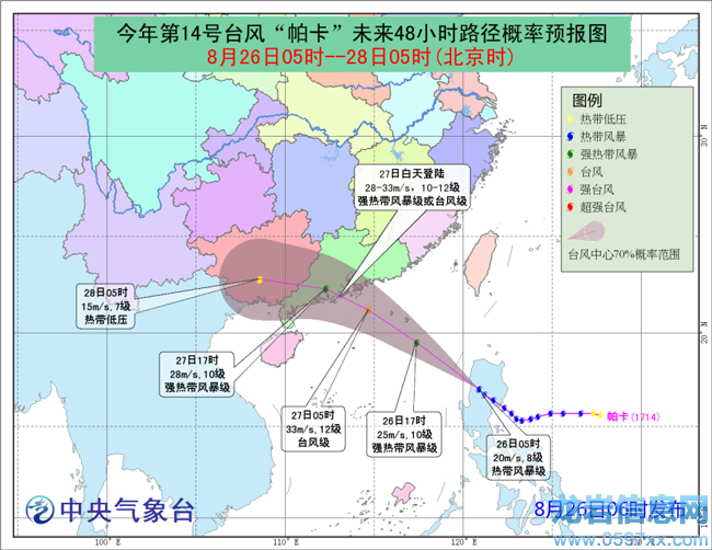 北京時(shí)間記者剛剛從中國氣象局獲悉,中央氣象臺(tái)8月26日06時(shí)繼續(xù)發(fā)布臺(tái)風(fēng)黃色預(yù)警:預(yù)計(jì)今年第14號(hào)臺(tái)風(fēng)“帕卡”將于明日(27日)在我國廣東西部沿海登陸,最大可能登陸地點(diǎn)在廣東深圳到陽江一帶,登陸強(qiáng)度預(yù)計(jì)為強(qiáng)熱帶風(fēng)暴或臺(tái)風(fēng)級(jí)(28~35米/秒,10~12級(jí))。氣象專家提醒,雖然“帕卡”強(qiáng)度不及前臺(tái)風(fēng)“天鴿”,但登陸地點(diǎn)相似,風(fēng)雨影響區(qū)域重合,要謹(jǐn)防災(zāi)害疊加效應(yīng)。