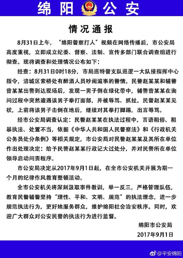 綿陽警方通報警察打醉漢:民警粗暴執法記大過