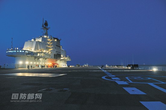 圖為遼寧艦甲板夜景。來源:國防部網站