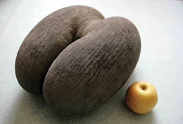 “復椰子不僅大,而且長相奇特,”上海植物園園長胡永紅今天向本報率先展示了這粒神奇的種子,“復椰子中央有個溝形,似兩個椰子合起來的一樣,并且酷似女性臀部,并有女性外生殖器的特征,所以人們把它稱為復椰子、雙椰子或臀形椰子。”